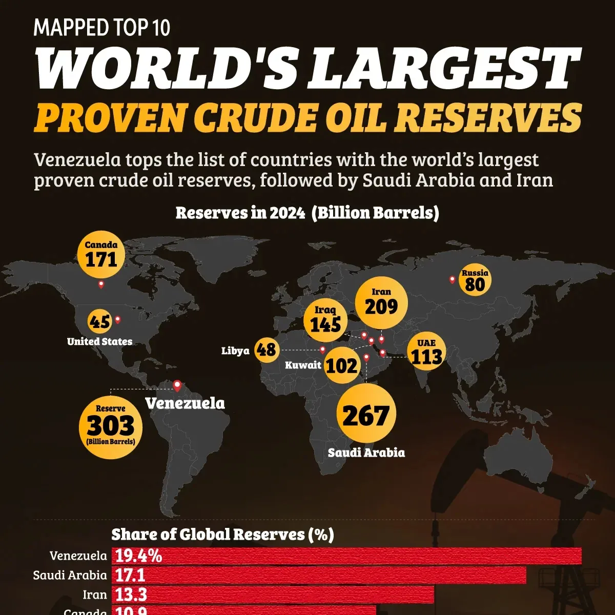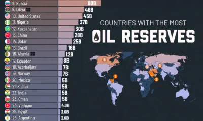 This chart puts in contrast the crude oil reserves and production of the world’s top 25 oil producing countries.