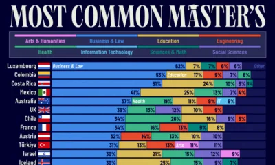 See the most common master’s degrees across 43 countries. Business & law are often the most popular, with exceptions in countries like Japan.